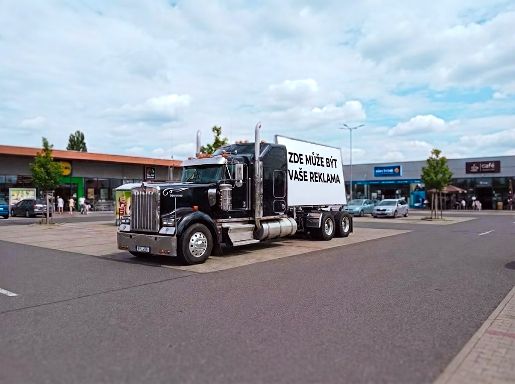 Nabízíme vysoce viditelnou reklamní plochu umístěnou na speciálním stojanu přímo za kabinou tahače.